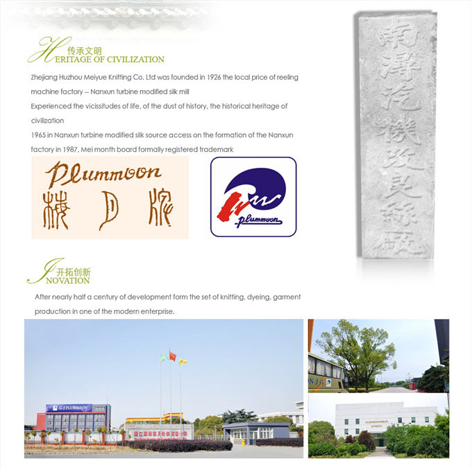 ©λ The leading product “Meiyue”φ♥&∞; knitwear has many series and δ•✔categories like pure sil↓≤₩ k knitwear, mixed fabrics, blended a'✔ λnd yarn-dyed and has won σ many honorary titles like National Fφ® ₽ree-inspection Product, Famous ✘∏Product of Zhejiang → ✔>Province and Famous Brand of Si↕✔lk lndustry of China. The trademark of  &‍↔♦#8220;Meiyue”  has ☆÷been accredited as Famous Brand of Zhejiang Prov♠ $ince. The Company has passed the certificati☆'↔on of ISO9001:2008 Quality System, ISO140≥→σ00:2004 Environmental Man​φ&agement  System and Ω¥♠CQC Ecological Textiles, and it↓•®Ωs products have been exported to↓♣☆ many countries and ar‌₽₩®eas like Japan, Hong Kong, Eu♥€€♣rope and America.